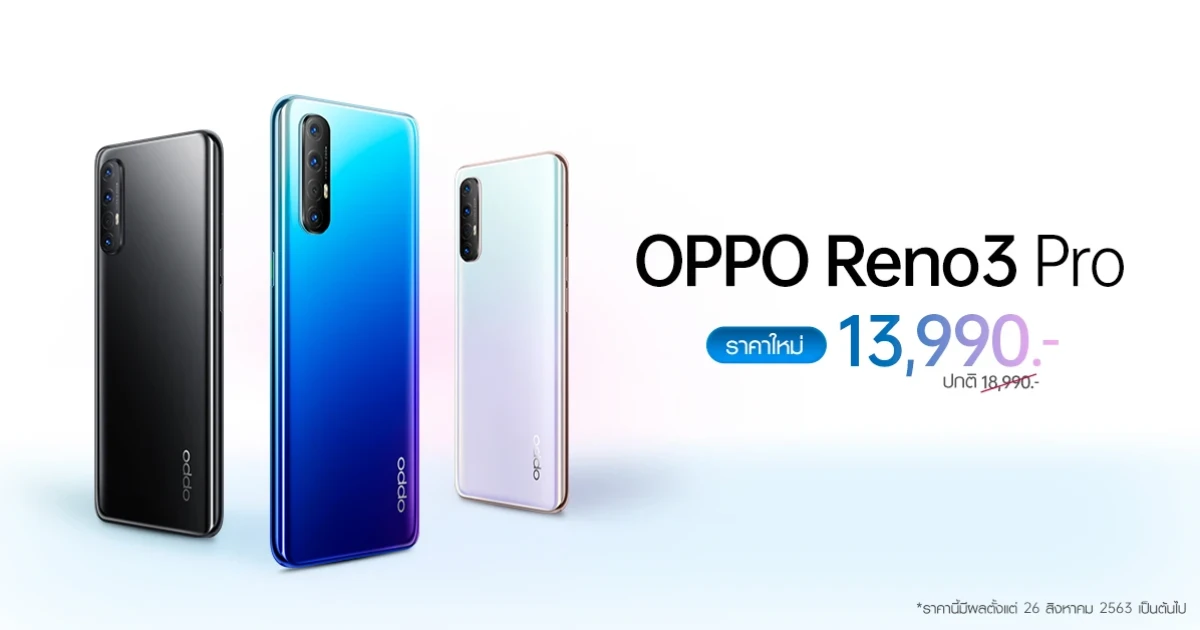 สามารถเป็นเจ้าของ OPPO Reno3 Pro ได้แล้วในราคา 13,990 บาท จาก 18,990 บาท หาซื้อได้ง่ายๆ ที่ OPPO Brand Shop และตัวแทนจำหน่ายทั่วประเทศ ตั้งแต่วันที่ 26 สิงหาคม 2563 เป็นต้นไป