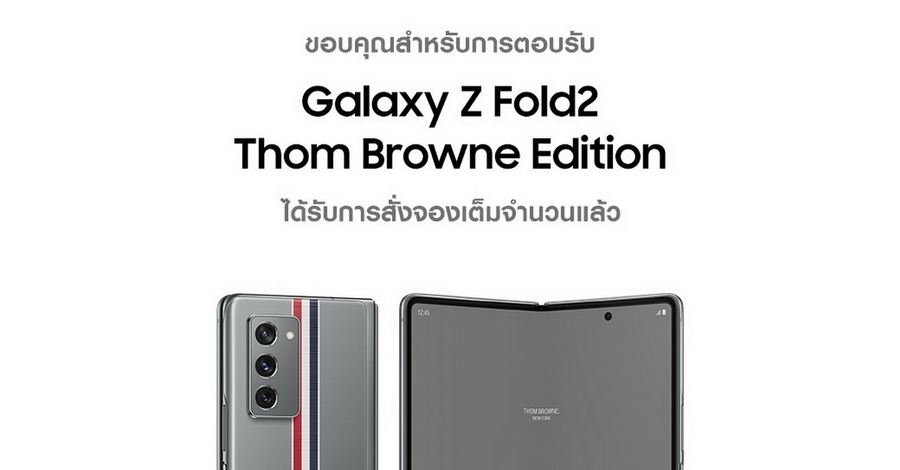 Samsung Galaxy Z Fold2 Thom Browne Edition ผลงานการร่วมมือครั้งใหม่ของซัมซุงและแบรนด์แฟชั่นไฮเอนด์ระดับโลกอย่าง Thom Browne ราคา 109,900 บาท ในคอลเลคชันประกอบไปด้วย Samsung Galaxy Z Fold2 5G, Galaxy Watch3, Galaxy Buds Live และ Accessories ต่างๆ โดยทั้งหมดมาในดีไซน์สีเทาพร้อมแถบสีน้ำเงินและสีแดงสุดไอคอนิก ประเทศไทยถือเป็น 1 ใน 7 ประเทศแรกของโลกที่ได้เปิดจองคอลเลคชันสุดเอ๊กซ์คลูซีฟนี้ เปิดจองในประเทศไทยไปเมื่อเช้าที่มาผ่าน ล่าสุดไม่ถึง 1 วัน จองเต็มเรียบร้อยแล้ว
