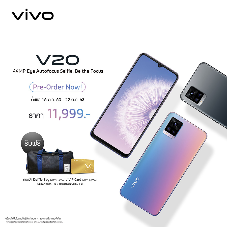- สำหรับผู้ที่ทำการจอง Vivo V20 สามารถรับเครื่องพร้อมของแถมในวันที่ 23 ตุลาคม 2563 เป็นต้นไป