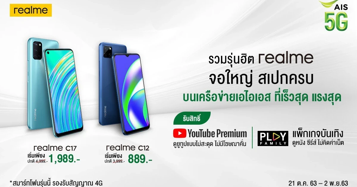 realme C12 และ realme C17 กับโปรแพ็กเกจ AIS Hot Deal เริ่มต้นเพียง 889 บาท! พร้อมรับสิทธิ์ Youtube Premium และ AIS Play ฟรี วันนี้ - 2 พฤศจิกายนนี้เท่านั้น ที่ AIS, AIS Shop และ Telewiz พบกับสมาร์ทโฟนพร้อม AIS Hot Deal ในราคาพิเศษ ดังนี้