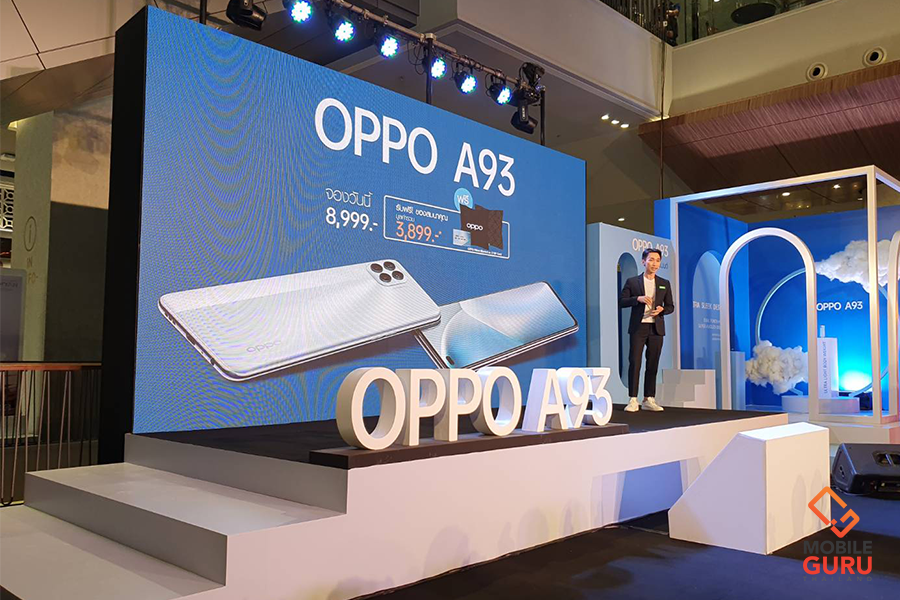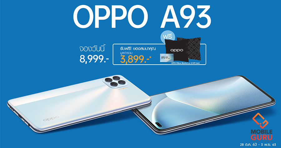 สนุกทุกโมเมนต์ได้แล้วกับ OPPO A93 รุ่นใหม่ล่าสุด มาใน 2 สี ได้แก่ สีขาว Metallic White และ สีดำ Matte Black ในราคา 8,999 บาท พร้อมรับฟรี! ของสมนาคุณ OPPO Pillow Blanket และ E-VIP Card มูลค่ารวม 3,899 บาท เมื่อพรีออเดอร์ ที่ OPPO Brand Shop และตัวแทนจำหน่ายที่ร่วมรายการ หรือ สามารถพรีออเดอร์ได้ในราคาเริ่มต้นเพียง 4,489 บาท เมื่อพรีออเดอร์พร้อมแพ็คเกจที่กำหนดกับผู้ให้บริการเครือข่ายที่ร่วมรายการ ตั้งแต่วันที่ 28 ตุลาคม ? 3 พฤศจิกายน 2563