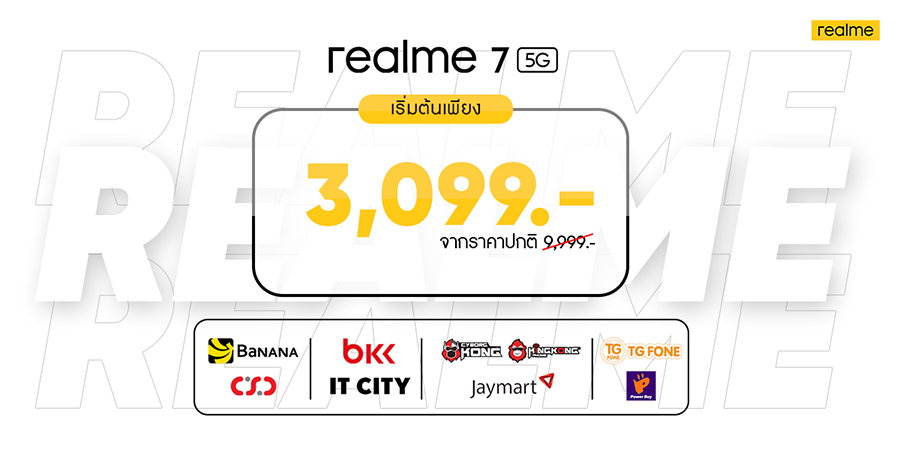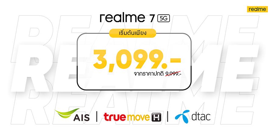 สำหรับช่องทาง AIS, Truemove H และ dtac สามารถเป็นเจ้าของ realme 7 5G ได้ในราคาเริ่มต้นเพียง 3,099 บาทเท่านั้น ในวันที่ 5 ธันวาคมนี้ พร้อมโปรโมชั่นผ่อน 0% สูงสุด 10 เดือนและรับประกันเครื่องนาน 24 เดือน