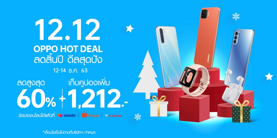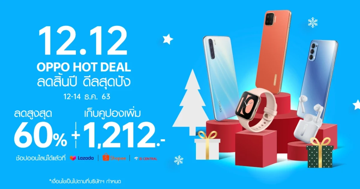 OPPO มอบโปรแรงส่งท้ายปี ด้วยส่วนลดสูงสุดถึง 60% พร้อมแจกโค้ดสุดคุ้มตลอดวันสูงสุด 1,212 บาท และของแถมเพียบ! รวมมูลค่ากว่า 260,000 บาท ใน OPPO 12.12 Hot Deal ที่ Lazada และ JD Central ตั้งแต่วันที่ 12 - 14 ธันวาคมนี้ สำหรับ Shopee ตั้งแต่วันที่ 12 - 15 ธันวาคมนี้