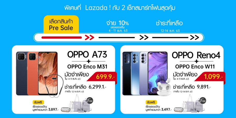 OPPO มอบเซอร์ไพร์สส่งท้ายปี กับโปรโมชั่นจองก่อนคุ้มกว่า โดยเมื่อจองเซ็ตสินค้าที่ร่วมรายการ ในวันที่ 4 - 11 ธันวาคม 2563 พร้อมชำระ 10% ของราคาสินค้า และ ชำระค่าสินค้าที่เหลือในวันที่ 12 - 14 ธันวาคม 2563 โดยมี 2 เซ็ตให้เลือกดังนี้