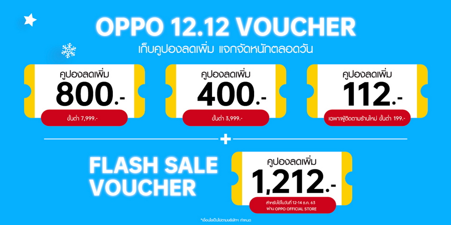- Flash Sales Voucher แจกคูปองพิเศษตามช่วงเวลาที่กำหนดใน Lazada และ Shopee โดย 12:00 ของวันที่ 7-11 ธันวาคม 2563 แจกคูปองส่วนลด 1,212 บาท เมื่อซื้อขั้นต่ำ 8,999 บาท กับทุกสินค้าภายใน OPPO Official Store ใช้ได้เฉพาะวันที่ 12 ธันวาคม 2563 เท่านั้น และ เฉพาะเวลา 0:00, 9:00, 12:00, 18:00 และ 20:00 ของวันที่ 12 ธันวาคม 2563 แจกคูปองส่วนลด 1,212 บาท เมื่อซื้อขั้นต่ำ 9,999 บาท กับทุกสินค้าภายใน OPPO Official Store และใช้ได้เฉพาะวันที่ 12 ธันวาคม 2563 เท่านั้น