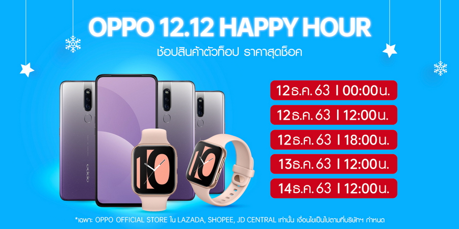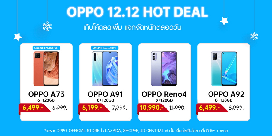 OPPO พร้อมให้คุณเป็นเจ้าของสมาร์ทโฟนและอุปกรณ์เสริมในราคาสุดคุ้มได้แล้ว ในวันที่ 12 - 14 ธันวาคม 2563 ที่ OPPO Official Store ใน Lazada และ JD Central และในวันที่ 12 - 15 ธันวาคม 2563 ที่ OPPO Official Store ใน Shopee