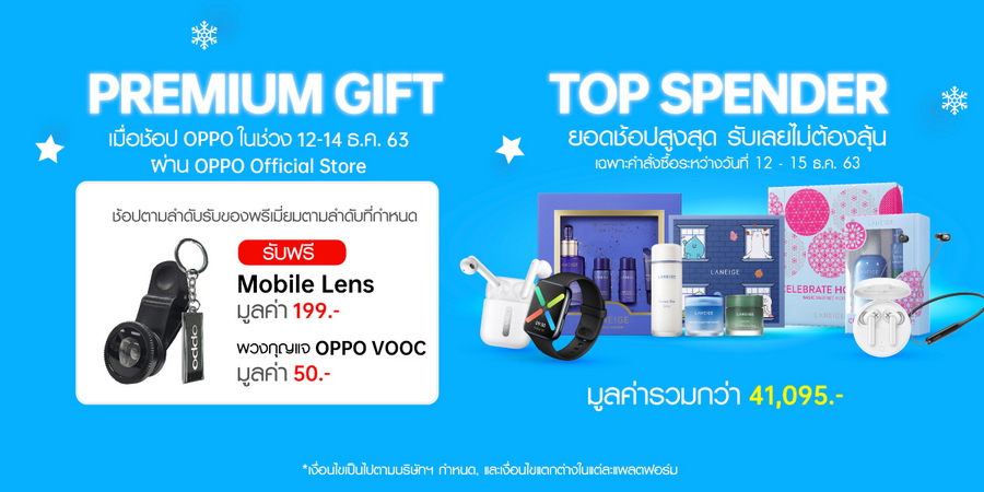 - เมื่อมียอดซื้อสูงสุด 8 อันดับแรก ผ่าน OPPO Official Store ใน Shopee รับฟรี OPPO Watch 46mm สี Black, Laneige No.4 1.11 Best Seller Set, Laneige No.1 Laneige PRY Regenerator Set 1, OPPO Enco Free True Wireless Headphones สีดำ, Laneige No.6 Basic Duo Set Moisture, OPPO Enco W31 สีขาว, Laneige No.5 Water Bank Moisture Essence Set และ OPPO Enco M31 สีดำ ตามลำดับ