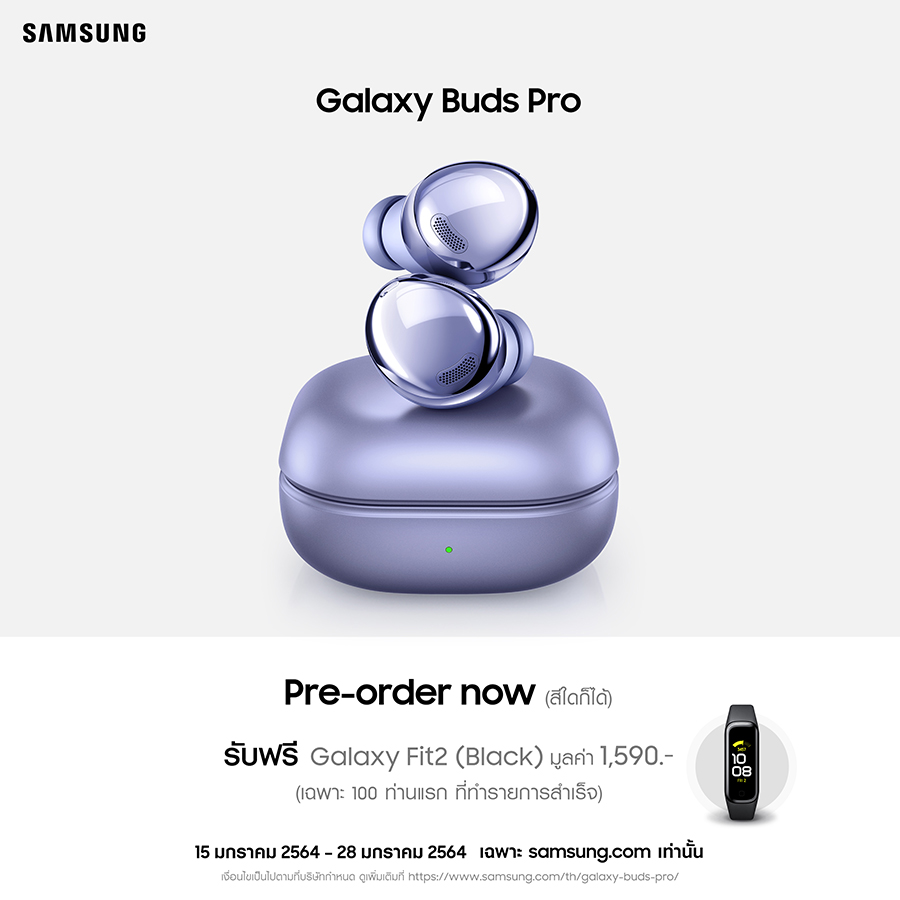 พิเศษ สำหรับ 100 ท่านแรกที่สั่งซื้อ Galaxy Buds Pro ล่วงหน้าและทำการสั่งซื้อสำเร็จ ตั้งแต่วันที่ 15-28 มกราคม 2564 ผ่านทาง samsung.com รับฟรี! Galaxy Fit2 สี Black มูลค่า 1,590 บาท โดยสามารถรับสินค้าได้ตั้งแต่วันที่ 27 มกราคม - 28 กุมภาพันธ์ 2564