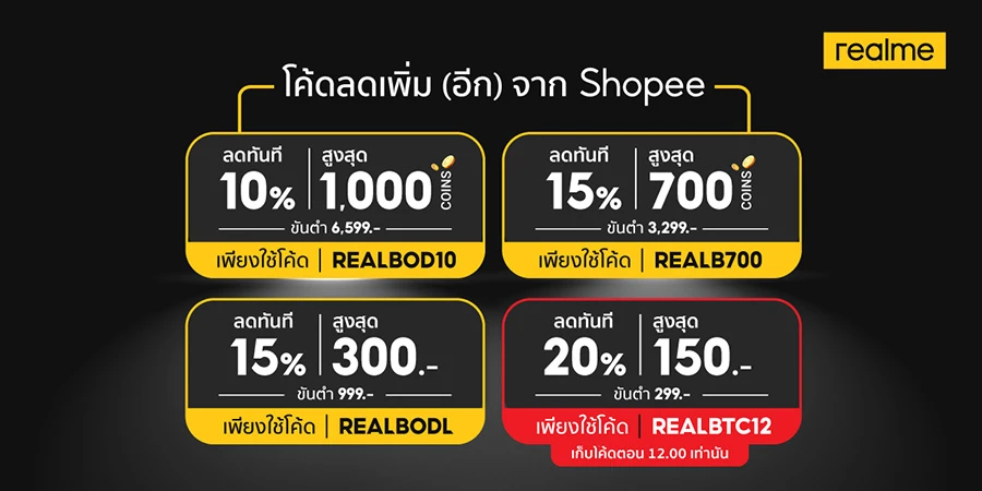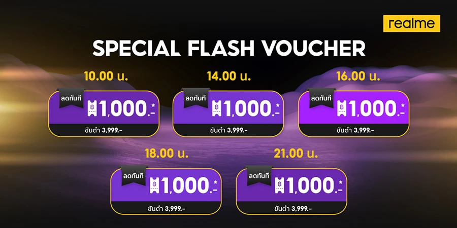 นอกจากนี้ realme ยังแจก Special Flash Voucher โค้ดจัดเต็ม 5 ช่วงเวลาทั้งวัน ดังนี้ เวลา 10:00 น. / 14:00 น. / 16:00 น. / 18:00 น. และ 21:00 น. พบกับโค้ดลดทันที 1,000 บาท เมื่อซื้อขั้นต่ำ 3,999 บาท