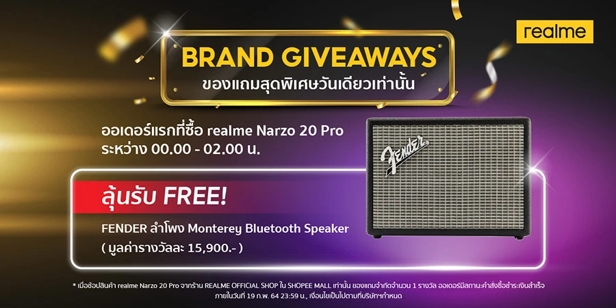 - สำหรับออเดอร์แรกที่ซื้อ realme narzo 20 Pro ระหว่าง 00:00 - 02:00 น. ลุ้นรับฟรี FENDER ลำโพง Monterey Bluetooth Speaker มูลค่า 15,900 บาท