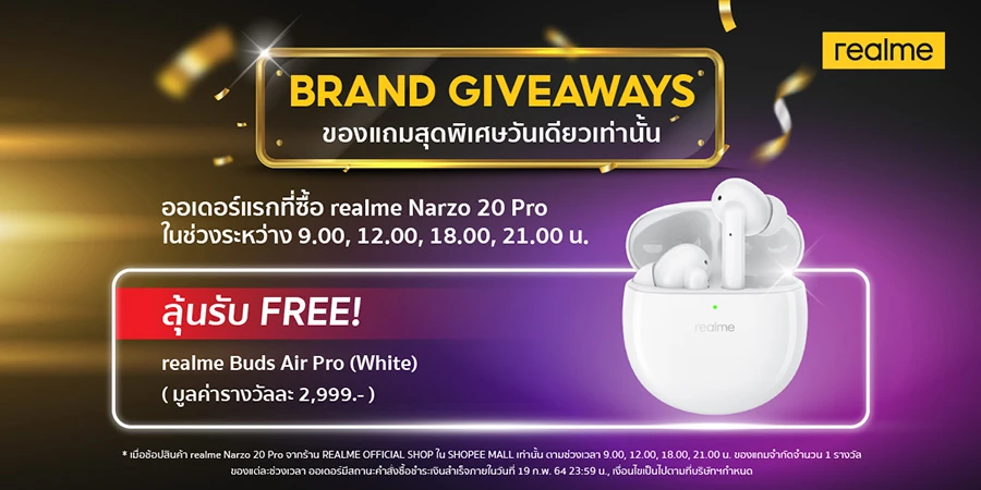- สำหรับออเดอร์แรกที่ซื้อ realme narzo 20 Pro ช่วงเวลา 09:00 น. / 12:00 น. / 18:00 น. และ 21:00 น. ลุ้นรับฟรี realme Buds Air Pro สีขาว มูลค่า 2,999 บาท
