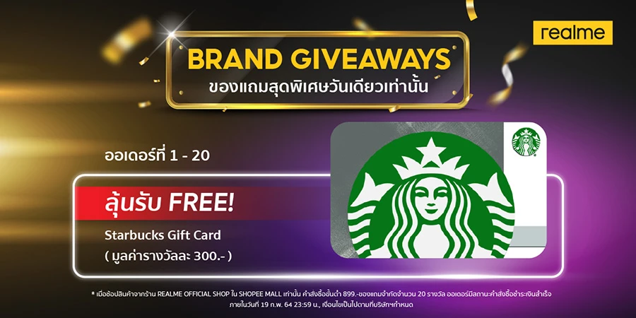 - สำหรับออเดอร์ที่ 1 - 20 เมื่อสั่งซื้อขั้นต่ำ 899 บาท ลุ้นรับฟรี Starbuck Gift Card มูลค่า 300 บาท