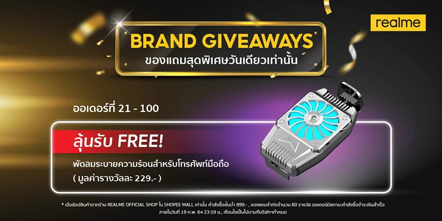 - สำหรับออเดอร์ที่ 21 - 100 เมื่อสั่งซื้อขั้นต่ำ 899 บาท ลุ้นรับฟรี พัดลมระบายความร้อนสำหรับโทรศัพท์มือถือ มูลค่า 229 บาท