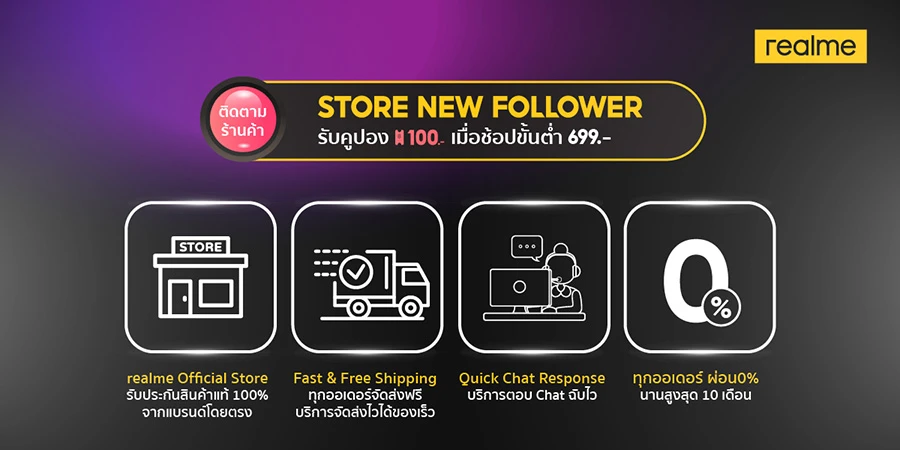 ฟรี! คูปอง 100 บาท เมื่อกดติดตาม realme Official Store บน Shopee เฉพาะวันที่ 19 กุมภาพันธ์ 2564 นี้เท่านั้น ช่องทางการสั่งซื้อ bit.ly/37iPL3w