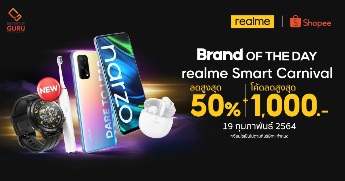 realme Smart Carnival โปรโมชั่นลดสูงสุด 50% พร้อมโค้ดลดสูงสุด 1,000.- วันที่ 19 ก.พ. นี้ ผ่านทาง Shopee เท่านั้น