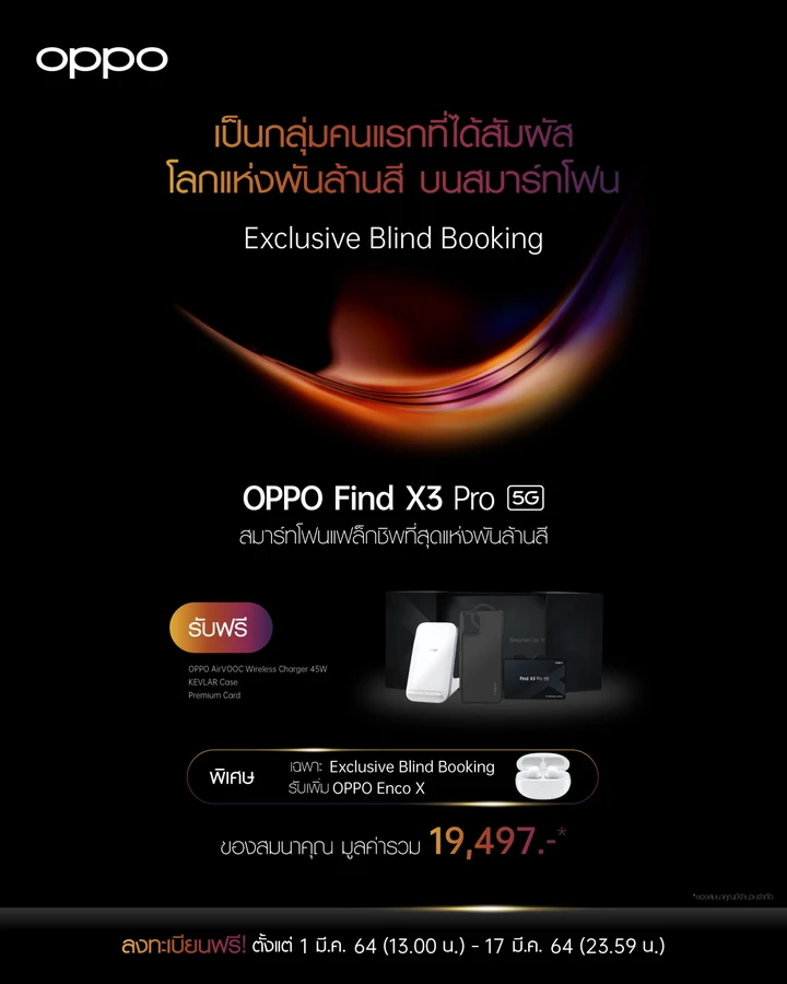 ในประเทศไทยทาง OPPO Thailand ได้เปิดจอง OPPO Find X3 Pro ล่วงหน้าแล้ว วันนี้ - 17 มี.ค. 64 พร้อมรับของสมนาคุณสุดพิเศษ! มูลค่ารวม 19,497 บาท ได้แก่ OPPO AirVOOC Wireless Charger 45W, KEVLAR Case และ Premium Card พร้อมได้รับ OPPO Enco X หูฟังแฟล็กชิพของระบบแอนดรอยด์ที่สร้างสรรค์ร่วมกับ Dynaudio ใครอยากได้ของแถมจัดหนัก ก็ต้องจองกันแล้วละครับ https://bit.ly/2NfZIYz
