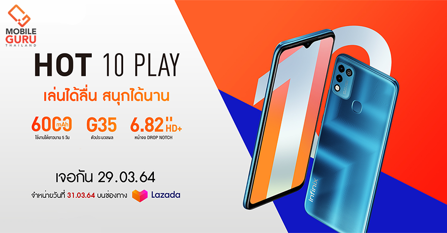 พลาดไม่ได้แล้ว! กับ Infinix HOT 10 PLAY พร้อมเปิดตัวในประเทศไทยวันที่ 29 มีนาคม 2564 ด้วยราคาสุดคุ้มไม่เกิน 4,000 บาท และจะวางจำหน่ายบนลาซาด้าและร้านตัวแทนจำหน่ายทั่วประเทศพร้อมกันในวันที่ 31 มีนาคม 2564 ผู้สนใจค้นหารายละเอียดเพิ่มเติมได้ที่ https://bit.ly/3bT3uAw
