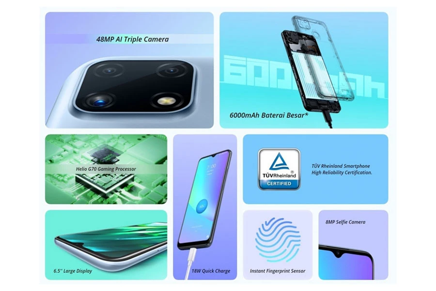 realme C25 มาพร้อมหน้าจอแสดงผล 6.5 นิ้ว ความละเอียดระดับ HD+ ตรงบริเวณรอยหยดน้ำมีกล้องหน้าความละเอียด 8MP (F2.0) ด้านหลังตัวเครื่องมีแป้นสแกนลายนิ้วมือ และกล้องหลัง Triple camera 48MP + Macro 2MP + Monochrome 2MP