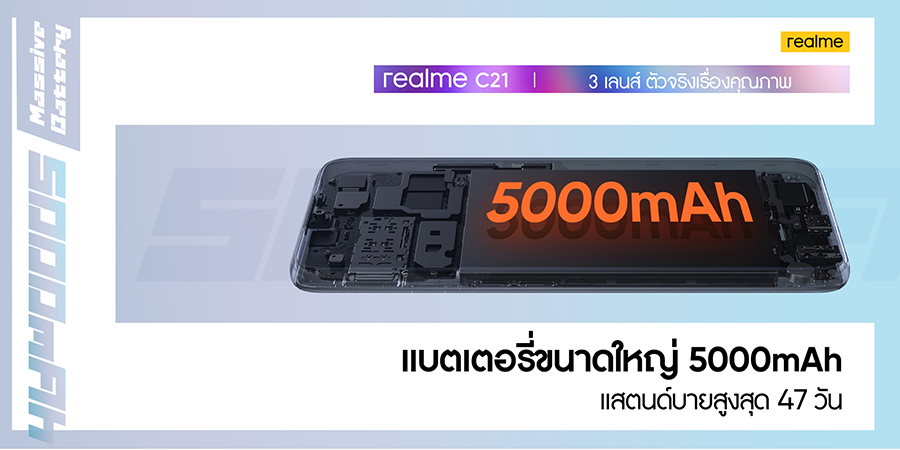 realme แบรนด์สมาร์ทโฟนเพื่อคนรุ่นใหม่ที่เติบโตเร็วที่สุดในโลก วางจำหน่าย realme C21 '3 เลนส์ ตัวจริงเรื่องคุณภาพ' สมาร์ทโฟนที่มาพร้อมกล้องหลัง 3 เลนส์ 13 ล้านพิกเซล การรับรองคุณภาพจาก TUV Rheinland Certified และแบตเตอรี่ 5000 มิลลิแอมป์ ชิปเซ็ต Helio G35 โดยมากับความจุ 3+32 GB ในราคาเพียง 4,299 บาท สามารถเป็นเจ้าของได้แล้ววันนี้ ที่ realme Brand Shop และตัวแทนจำหน่ายทั่วประเทศ
