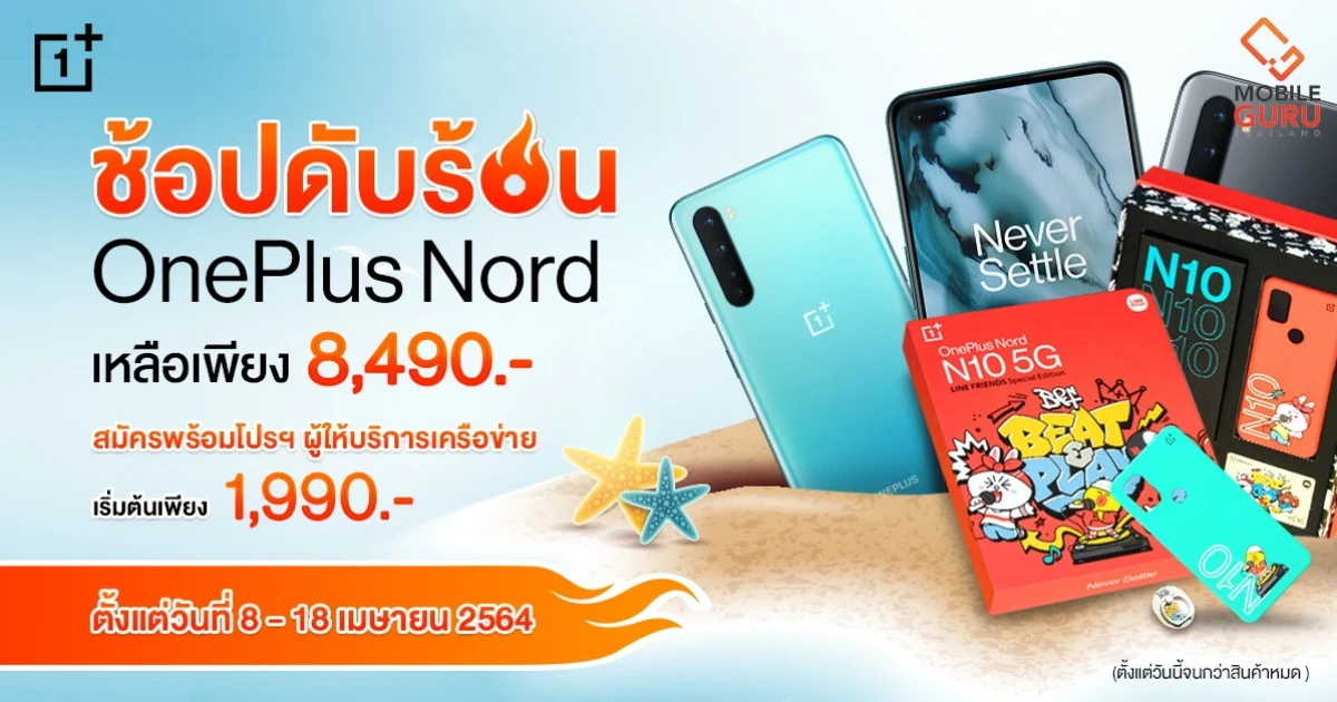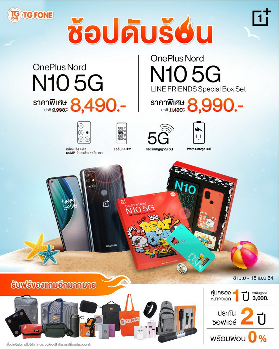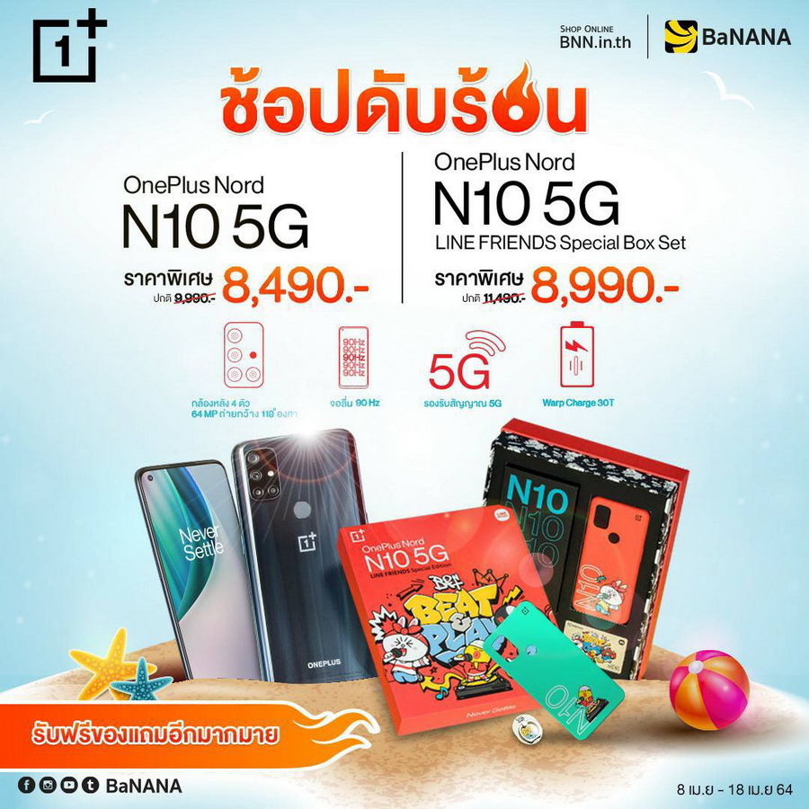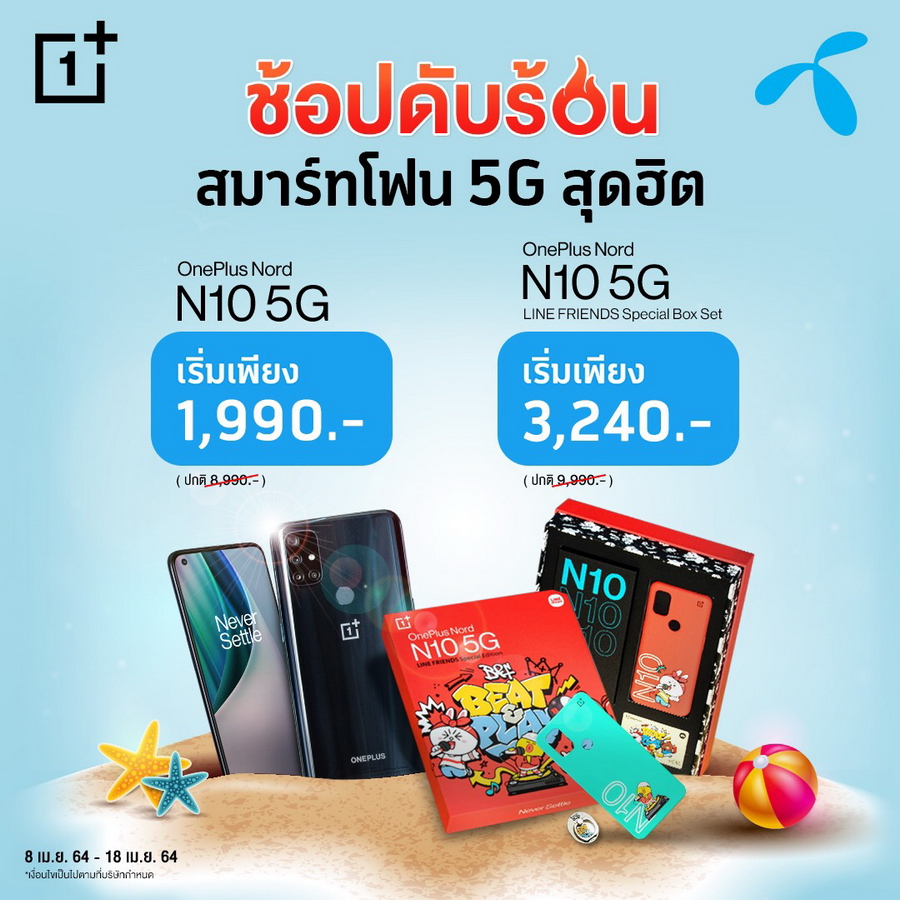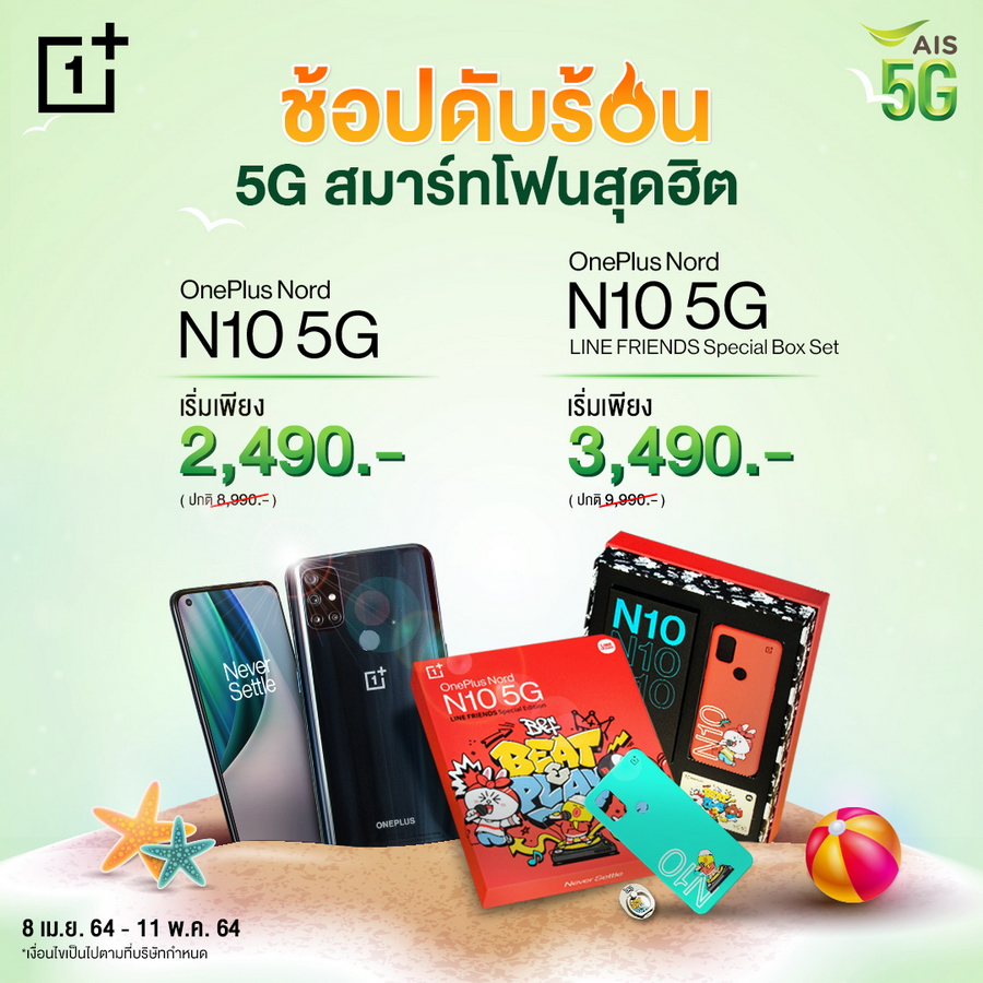 - AIS เมื่อซื้อ OnePlus Nord N10 5G หรือ LINE FRIENDS Special Box Set พร้อมแพ็กเกจรายเดือน 5G Hot Deal Max Speed เริ่มต้น 699 บาท (พร้อมชำระค่าบริการล่วงหน้า) ราคาเครื่องเริ่มต้นเหลือเพียง 2,490 บาท ตั้งแต่วันนี้ - 11 พฤษภาคม 2564