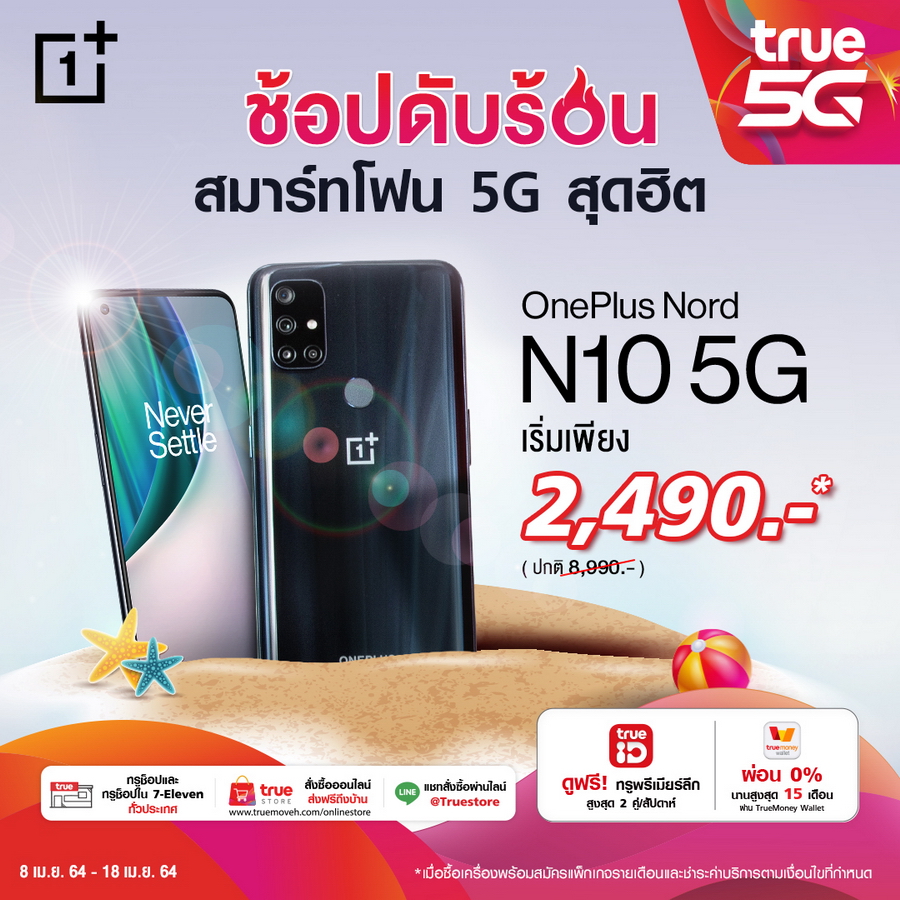 - TrueMove H เมื่อซื้อ OnePlus Nord N10 5G พร้อมแพ็กเกจรายเดือนเริ่มต้นที่ 699 บาทขึ้นไปได้ในราคาเริ่มต้นเพียง 2,490 บาท (ปกติ 8,990 บาท) ได้ตั้งแต่วันนี้ - 18 เมษายน 2564 ที่ทรูช็อป และทรูช็อปใน 7-Eleven ทั่วประเทศ หรือทางเว็บไซต์