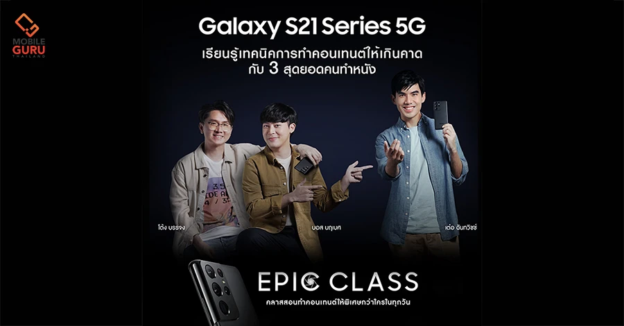 พร้อมร่วมเรียนรู้เทคนิคการทำคอนเทนต์ให้เกินคาดกับ 3 สุดยอดคนทำหนังด้วย Galaxy S21 Ultra 5G แบบฉบับเต็มได้ที่ www.samsung.com/th/s21-epicclass พร้อมรับพิเศษส่วนลด 4,000 บาท ระหว่างวันนี้ - 30 เมษายน 2564 ที่ Samsung Experience Store, Samsung.com และร้านค้าที่ร่วมรายการ