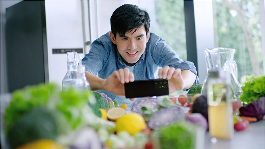 "สำหรับผม การถ่ายภาพอาหารสีต้องสวยเป็นอันดับแรก เพราะสีที่สด อิ่ม จะทำให้ภาพดูน่ากิน โดยสมาร์ทโฟนที่มาพร้อมเซ็นเซอร์ขนาดใหญ่ อย่าง Galaxy S21 Ultra 5G จะทำให้เก็บภาพได้ครบทุกเฉดสี พร้อมยังมอบความคมชัด สะกดทุกสายตา ลำดับต่อมา คือการบอกเล่าเรื่องราวผ่านมุมมองใหม่ๆ จากการถ่ายภาพด้วยมุมต่ำ หรือ low angle พร้อมใช้เลนส์ Ultra-wide ที่จะสร้างความแฟนตาซียิ่งกว่าเดิม และเทคนิคสุดท้ายเพื่อเพิ่มความมีชีวิตชีวาให้กับภาพอาหารไปอีกขั้น กับการใช้โหมด Slow motion ที่จะทำให้คุณสามารถเก็บภาพได้ในทุกรายละเอียด แม้แต่สายน้ำกระเซ็นในจังหวะที่ตาเรามองไม่เห็น หลังจากนั้นเพียงแค่นำฟุตเทจทั้งหมดมาตัดต่อด้วย S Pen เพียงแค่นี้คุณก็จะได้คอนเทนต์ที่สตัน จนต้องหยุดดูเลยครับ"