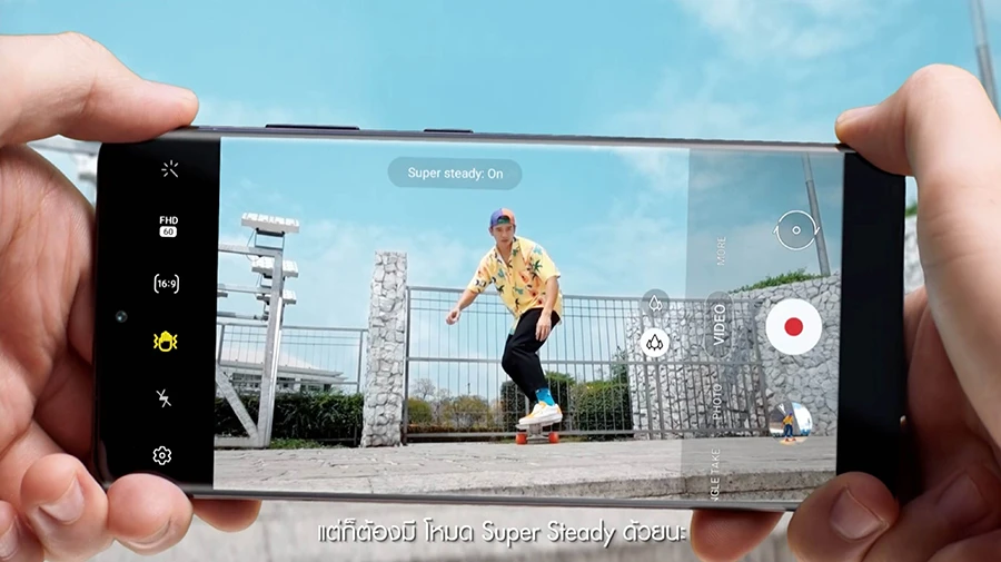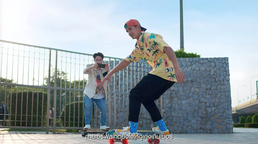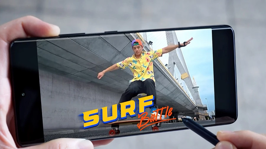 "ในช่วงที่เซิร์ฟสเกตกำลังฮิตแบบนี้ ผมเลยอยากมาแนะนำการใช้เทคนิคการถ่ายหนังเพื่อมาใช้กับคอนเทนต์ภาพเคลื่อนไหวแบบนี้ โดยทริคข้อหนึ่ง คือการบาลานซ์แสง เพราะการถ่ายเซิร์ฟสเกตที่มีแสงเปลี่ยนไปมา ต้องการสมาร์ทโฟนที่มีเซ็นเซอร์ขนาดใหญ่ ช่วยให้แสงไม่โดด แม้จะถ่ายในที่แสงจ้า ดีเทลในภาพก็ยังครบ ทริคที่สอง คือการเคลื่อนกล้องตามคนเล่น ซึ่งจะทำให้คนดูรู้สึกเหมือนได้เล่นเซิร์ฟสเกตไปพร้อมกับเรา โดยการถ่ายวิดีโอที่ต้องวิ่งตามคนถูกถ่าย การใช้สมาร์ทโฟนจะสะดวกที่สุด เพราะใช้งานง่าย และมีขนาดเบา แต่สมาร์ทโฟนเครื่องนั้นต้องมีโหมด Super Steady ด้วยที่ภาพได้มีความสมูทยิ่งขึ้น ทริคสุดท้าย กับการโชว์ท่าเก่งให้อิมแพกต์กว่าเดิม ด้วย Slow Motion ที่ถ่ายเพียงแค่ครั้งเดียว แต่เราสามารถเลือกทำให้ภาพช้าลงได้ถึง 2 จังหวะ ด้วยการใช้ S Pen เลือกจุดที่ต้องการ"