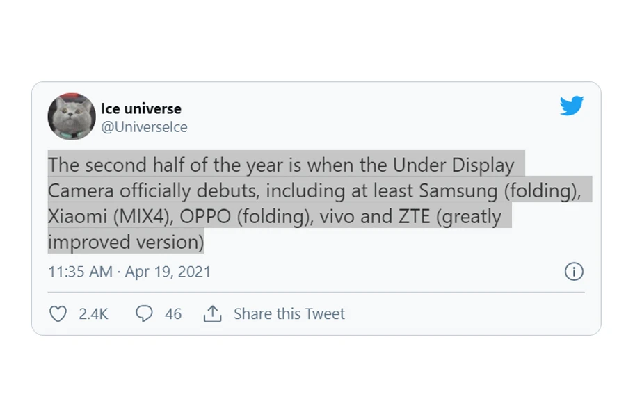 Ice Universe สื่อจอมหลุดชื่อดังออกมาเผยข้อมูลผ่านทวิตเตอร์ของตนเองว่า ภายในครึ่งปีหลังของปีนี้ เราอาจจะได้เห็นการมาของเทคโนโลยีกล้องซ่อนใต้หน้าจอบนสมาร์ตโฟนแบบทางการสักที หลังจากพัฒนากันมาหลายปี และอาจมีถึง 5 แบรนด์ใหญ่ที่จะนำร่องใช้งานบนสมาร์ตโฟนระดับท็อปของค่าย เช่น Samsung Galaxy Fold, OPPO Folding, Xiaomi Mi Mix 4 และอีกสองแบรนด์อย่าง Vivo และ ZTE ที่อาจตามมาในช่วงท้ายปีกับสมาร์ตโฟนปริศนาที่ยังไม่เปิดเผย
