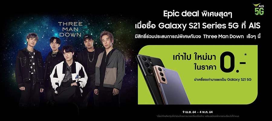 นอกจากนี้ ซัมซุงและเอไอเอส ยังมาพร้อมกับ Epic Deal สุดพิเศษ 'เก่าไป ใหม่มา ในราคา 0 บาท' เพียงนำโทรศัพท์รุ่นที่เข้าร่วมโครงการมาแลกซื้อ Samsung Galaxy S21 5G เครื่องใหม่ พร้อมสมัครแพ็กเกจตามเงื่อนไข ก็สามารถได้สุดยอดสมาร์ทโฟนแห่งยุครุ่นนี้ไปเลยฟรีๆ โปรโมชั่นสุด Epic แบบนี้ มีตั้งแต่วันนี้ - 4 พฤษภาคม 2564 ที่เอไอเอสเท่านั้น