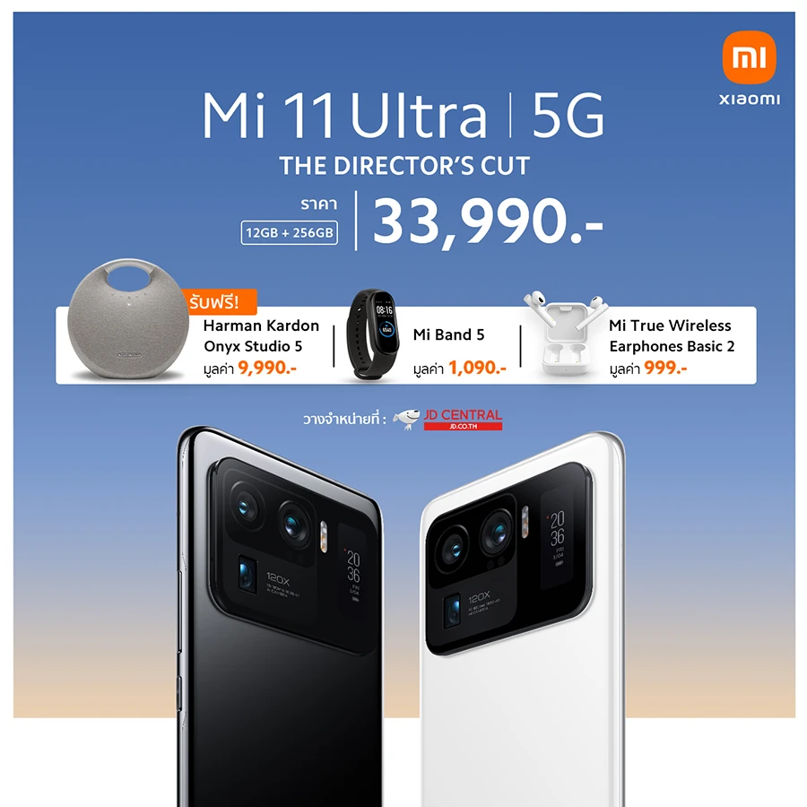 พิเศษ! สำหรับผู้ซื้อ Mi 11 Ultra รับของสมนาคุณ ดังนี้ ลำโพง Harman Kardon Onyx Studio 5 มูลค่า 9,990 บาท, Mi Band 5 มูลค่า 1,090 บาท และหูฟัง Mi True Wireless Earphone Basic 2 ราคา 999 บาท