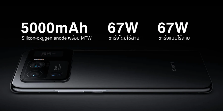 Mi 11 Ultra รองรับการชาร์จเร็วทั้งแบบใช้สายและไร้สายที่ 67W ถือว่าเร็วที่สุดในแวดวงสมาร์ทโฟนในปัจจุบัน สามารถชาร์จแบตเตอรี่ขนาด 5000mAh เต็มได้ในเวลาเพียง 36 นาที1 ไม่ว่าจะใช้สายหรือไร้สาย Mi 11 Ultra ใช้เทคโนโลยีชาร์จเร็ว 6 เท่าซึ่งเสียวหมี่เป็นผู้พัฒนาเทคโนโลยีขึ้นเอง วงจรรวมสำหรับชาร์จไร้สายที่รองรับได้ 30V รวมถึงระบบควบคุมกระแสไฟฟ้าอีกหลายระบบ ช่วยเพิ่มความเร็วในการชาร์จได้ 10%1 และยังสามารถชาร์จให้อุปกรณ์อื่น (Reverse Charing) ได้ที่กำลังไฟ 10 วัตต์ แบตเตอรี่ของ Mi 11 Ultra ผลิตโดยใช้วัสดุใหม่ คือ Nano silicon oxide cathodes รุ่นที่ 2 ซึ่งสามารถบรรจุลิเธียมไอออนได้สูงกว่า graphite cathodes รุ่นดั้งเดิมถึง 10 เท่า ให้ความพลังงานมาขึ้นและลดปัญหาแผงวงจรที่ต้องมีขนาดยาว