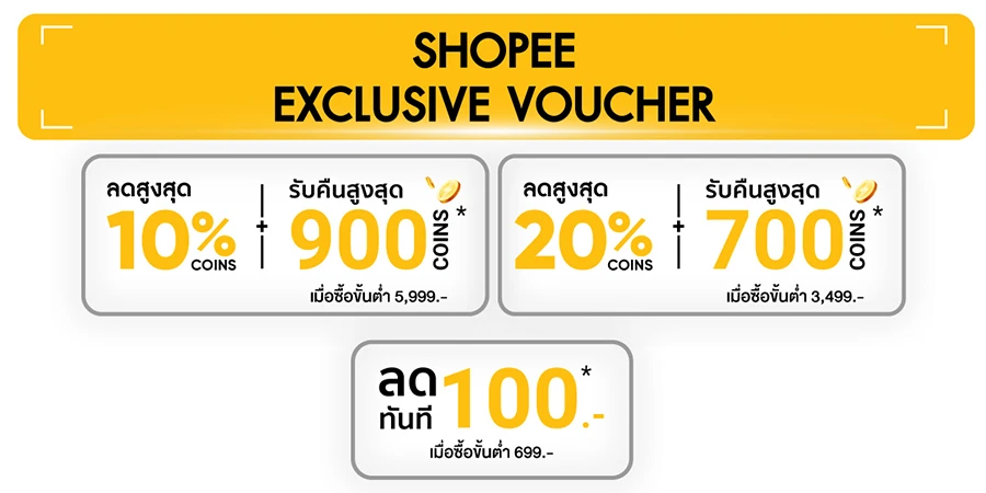 - เมื่อซื้อขั้นต่ำ 5,999 บาท รับส่วนลด 10% สูงสุด 900 Coin Cashback