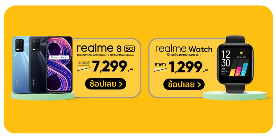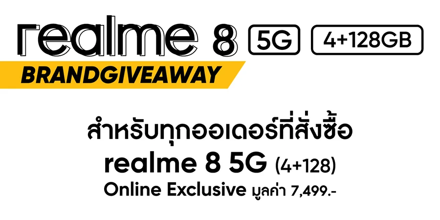 - realme 8 5G ความจุ 4GB + 128GB ราคาเพียง 7,299 บาท จากปกติ 7,499 บาท