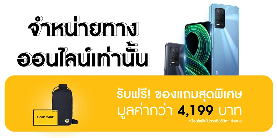 เมื่่อซื้อ realme 8 series ความจุ 4GB + 128GB ในราคาเพียง 7,299 บาท รับทันที E-VIP Card ประกันจอแตก 1 ปี และ realme Crossbag รวมมูลค่าของสมนาคุณมากกว่า 4,199 บาท