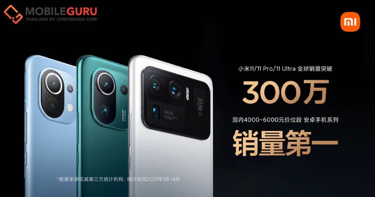 Xiaomi เปิดเผยตัวเลขยอดขายของ Mi 11 Series ที่ประกอบด้วย Xiaomi Mi 11 Ultra 5G, Mi 11 Pro และ Mi 11 ซึ่งทั้งสามรุ่นนับตั้งแต่เดือนมกราคมจนถึงเดือนเมษายน 2564 สามารถทำยอดขายรวมทั่วโลกได้มากกว่า 3 ล้านเครื่องทั่วโลกแล้ว โดยที่ตลาดสำคัญที่ทำให้เกิดตัวเลขนี้ได้สำเร็จคือ ตลาดประเทศจีน! ที่ Xiaomi กลับมาครองเจ้าตลาดแทน Huawei อีกครั้ง