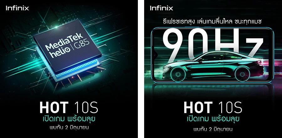 อินฟินิกซ์ (Infinix) เตรียมเปิดตัวสมาร์ตโฟนซีรีส์ใหม่ล่าสุด Infinix HOT 10S กับสโลแกน "Game on now - เปิดเกม พร้อมลุย" สมาร์ตโฟนสำหรับเล่นเกมและความบันเทิงเต็มรูปแบบ พร้อมสร้างมาตรฐานใหม่เพิ่มประสิทธิภาพการใช้งานให้ลื่นไหลด้วยชิปเซต MediaTek Helio G85 ผสานกับหน้าจอขนาดใหญ่พร้อมรีเฟรชเรท 90Hz เพื่อตอบโจทย์ความต้องการสำหรับนักเล่นเกมมือถือตัวยง และมอบประสบการณ์การรับชมที่ดีที่สุดอย่างเหนือระดับ