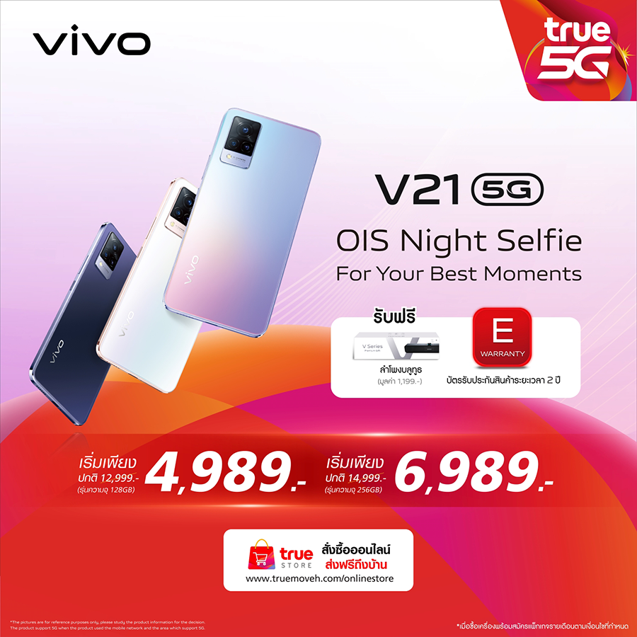 Vivo แบรนด์สมาร์ตโฟนชั้นนำระดับโลก ร่วมกับทรู ผู้ให้บริการเครือข่ายสื่อสารเคลื่อนที่ระดับภูมิภาค ส่งมอบโปรโมชันสุดพิเศษกับ Vivo V21 5G สมาร์ตโฟนเรือธงรุ่นใหม่ล่าสุดจากตระกูล V Series ภายใต้สโลแกน 'OIS Night Selfie, For Your Best Moment' ที่มาพร้อมกับกล้องหน้าความละเอียดสูงถึง 44MP รองรับระบบกันสั่นแบบ OIS รุ่นแรกของโลก สัมผัสประสบการณ์การเชื่อมต่อ 5G แบบ Dual Mode ทั้ง SA และ NSA ที่เร็วและแรงแบบไม่สะดุดผ่านเครือข่ายของทรู ในราคาเริ่มต้นเพียง 4,989 บาท เป็นเจ้าของได้แล้ววันนี้ผ่านช่องทางออนไลน์บนเว็บไซต์ True Store พร้อมรับของสมนาคุณสุดพรีเมียมและบริการจัดส่งสินค้าฟรีถึงบ้าน