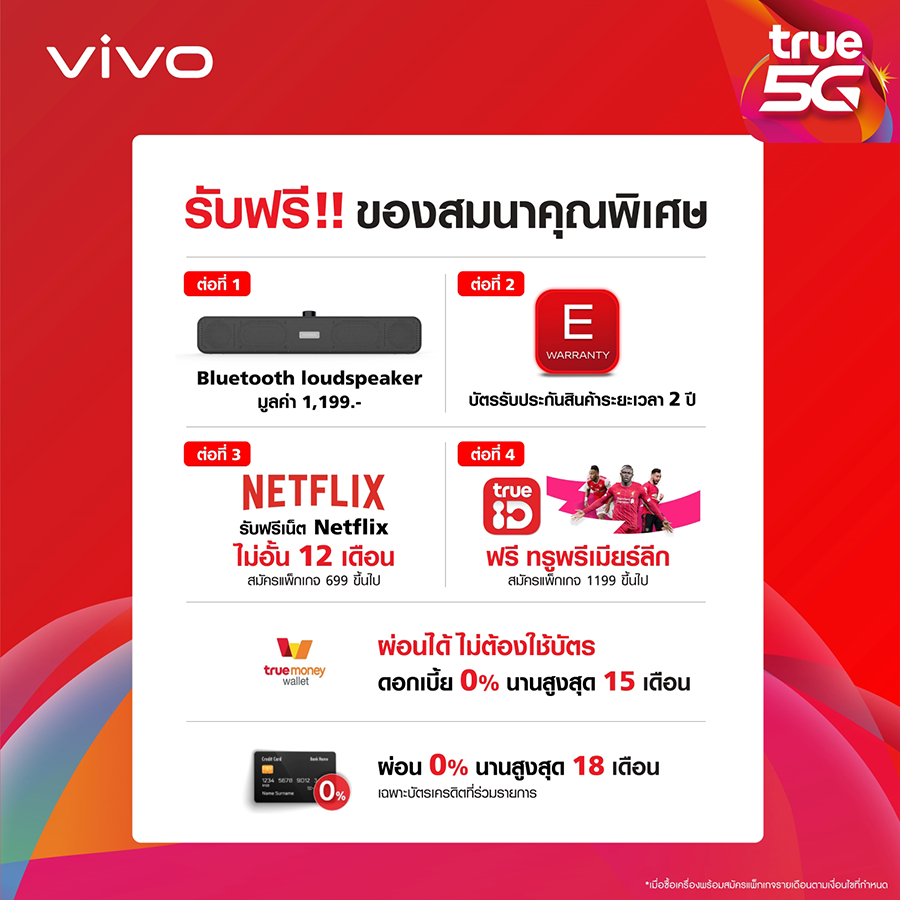 พิเศษสำหรับ ผู้ที่ซื้อ Vivo V21 5G ทุกรุ่นความจุ กับทรู ผ่านทางเว็บไซต์ True Store รับฟรี! ของสมนาคุณสุดพรีเมียมถึง 4 ต่อ ดังต่อไปนี้