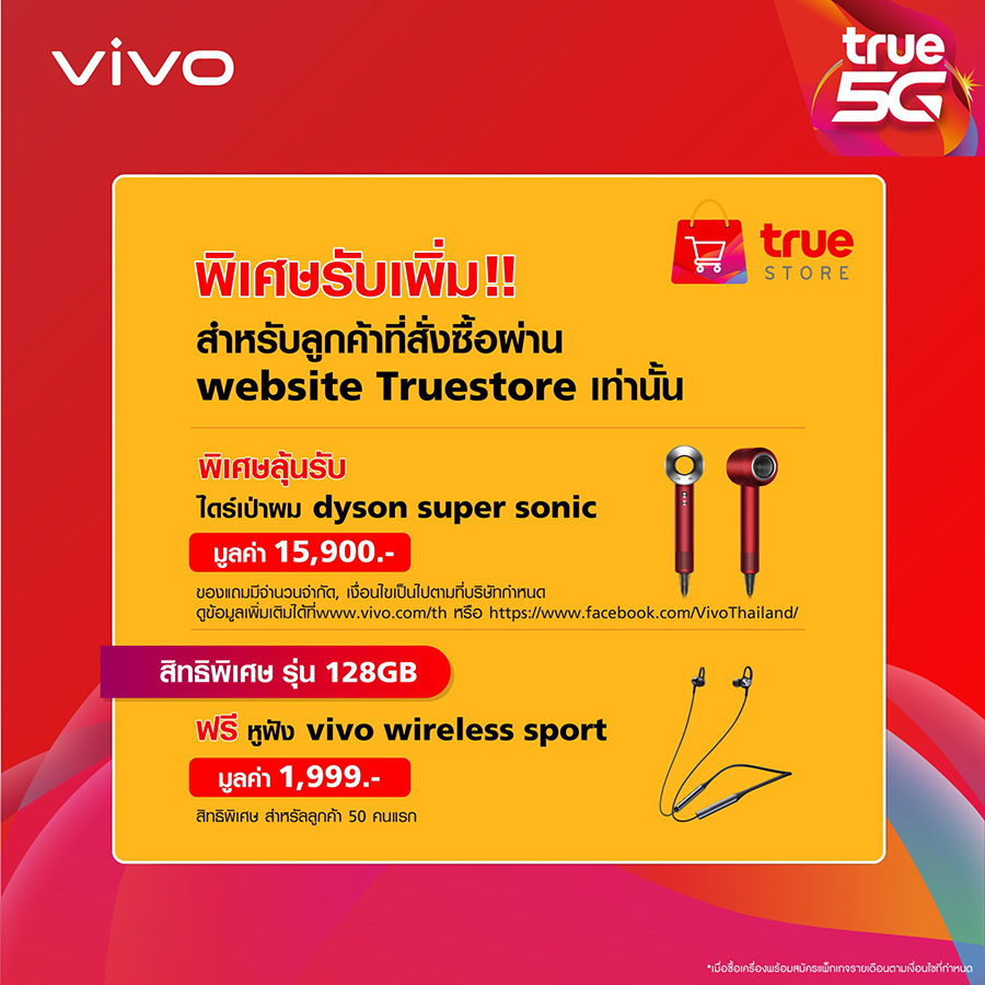และพิเศษสุดๆ สำหรับผู้ที่สั่งซื้อ Vivo V21 5G รุ่น RAM 8GB ความจุ 256GB ผ่านเว็บไซต์ Truestore ในราคาเริ่มต้นเพียง 6,989 บาท (ราคาเครื่องพร้อมแพ็กเกจ) จากราคาปกติ 14,999 บาท รับฟรีของแถมสมนาคุณ 4 ต่อ แถมยังได้รับสิทธิพิเศษในการ ลุ้นรับไดร์เป่าผม dyson super sonic มูลค่า 15,900 บาท อีกด้วย (สิทธิพิเศษเฉพาะรุ่นความจุ 256GB เท่านั้น) ด่วน! ของรางวัลมีจำนวนจำกัด รีบกดซื้อได้แล้ววันนี้