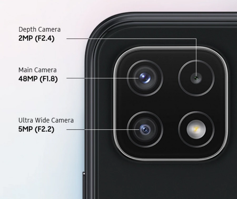 Samsung Galaxy A22 5G มาพร้อมสเปคหน้าจอ IPS ขนาด 6.6 นิ้ว ความละเอียด Full HD+ 1080 x 2400 pixels (399 ppi), รีเฟรชเรท 90Hz, Android 11, One UI Core 3.1, MediaTek Dimensity 700 5G, GPU Mali-G57 MC2, RAM 8GB, ROM 128GB รองรับ microSDXC, กล้องหน้า 8MP F2.0, กลองหลัง 3 เลนส์ 48MP F1.8, (wide), PDAF + 5MP F2.2, (ultrawide) + 2MP F2.4, (depth), แบตเตอรี่ความจุ 5000 mAh รองรับชาร์จใว 15W