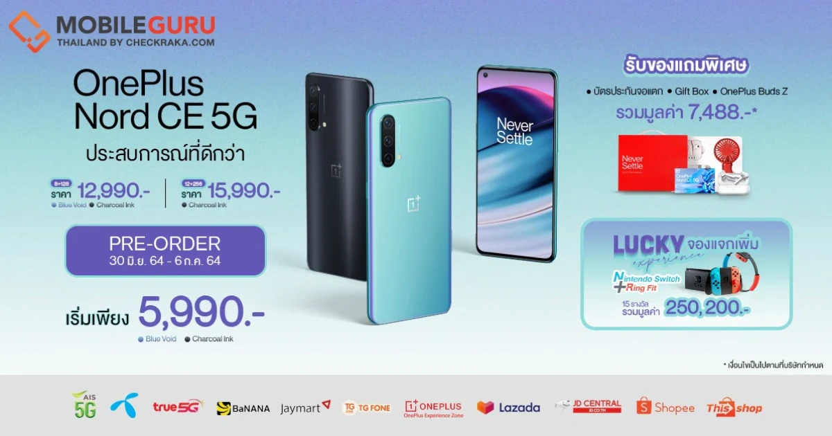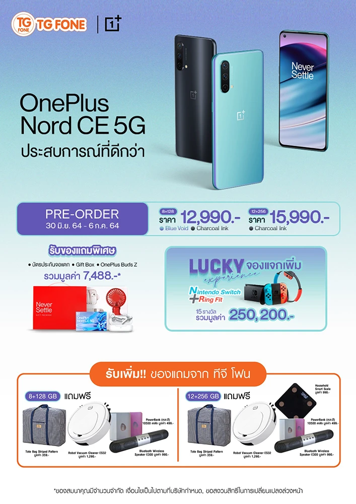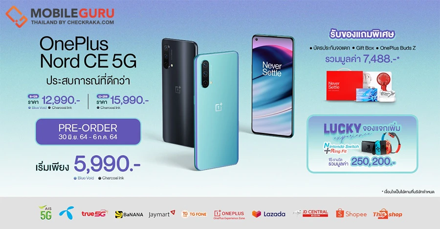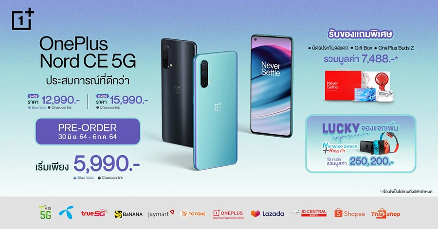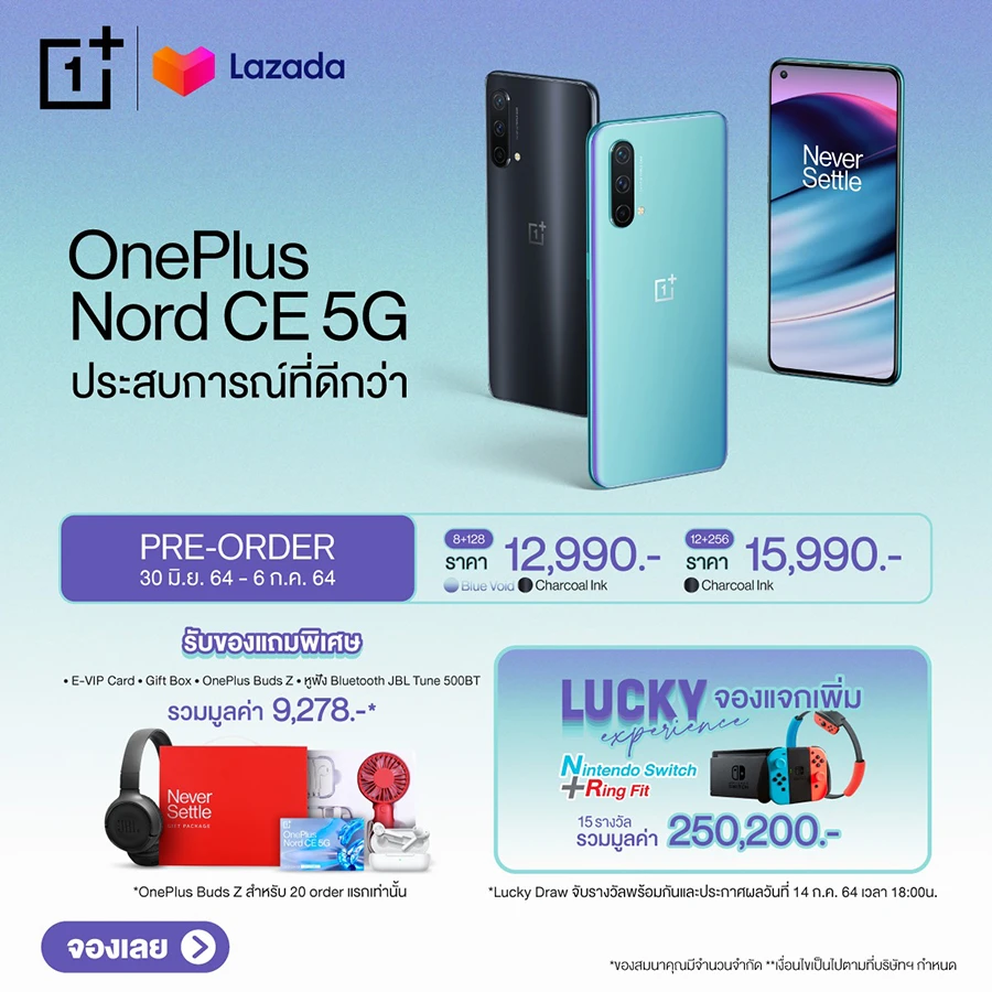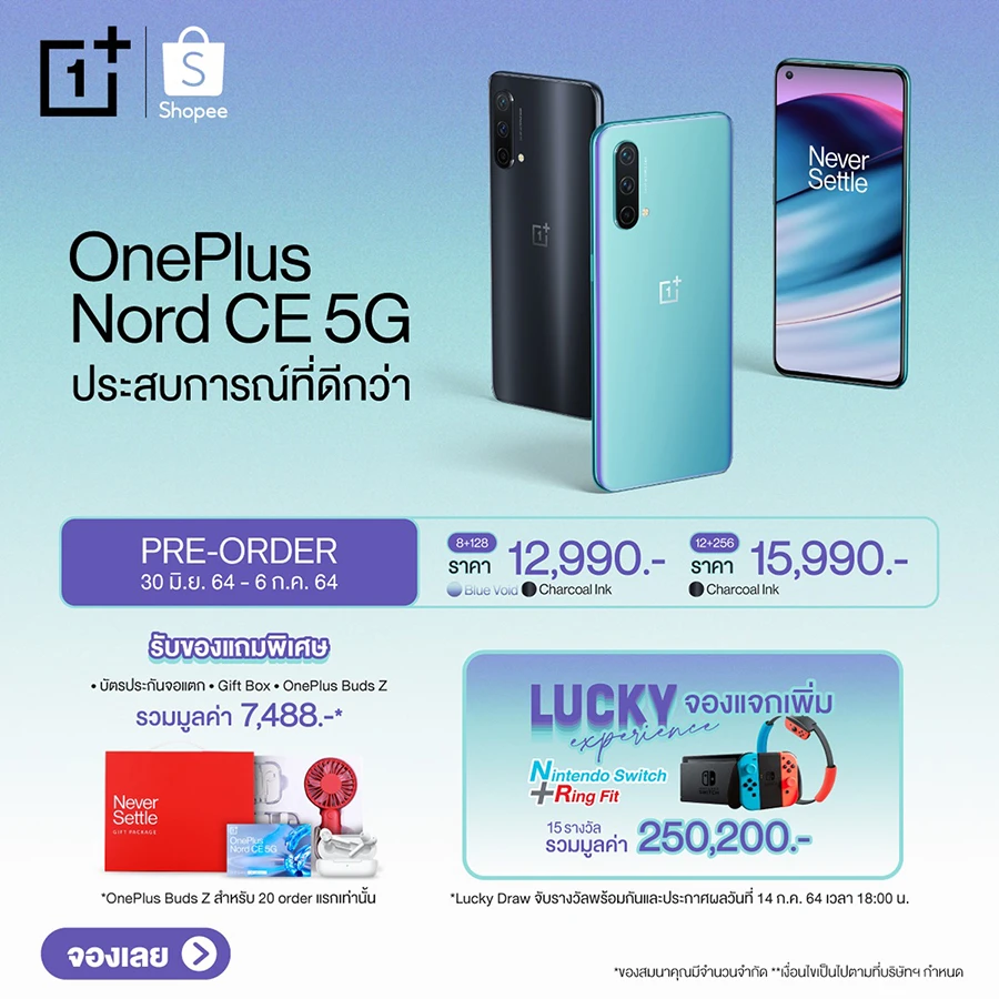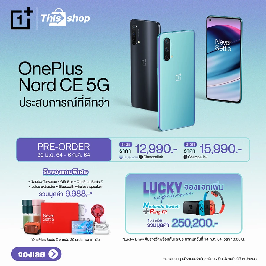 เท่านั้นยังไม่พอ ทาง OnePlus ยังมีกิจกรรม Lucky Experience จองแจกเพิ่ม : สำหรับผู้ที่จองสมาร์ทโฟน OnePlus Nord CE 5G ในระหว่างวันที่ 30 มิถุนายน - 6 กรกฎาคม 2564 ผ่านตัวแทนจำหน่ายอย่างเป็นทางการในประเทศไทย จะได้รับสิทธิ์ลุ้นรับรางวัล Nintendo Switch และ Ring Fit จำนวน 15 รางวัล มูลค่ารวมกว่า 250,200 บาท โดยประกาศรายชื่อผู้โชคดีผ่านทาง Facebook Fanpage OnePlus Thai ในวันที่ 14 กรกฎาคม 2564 ในเวลา 18.00 น.