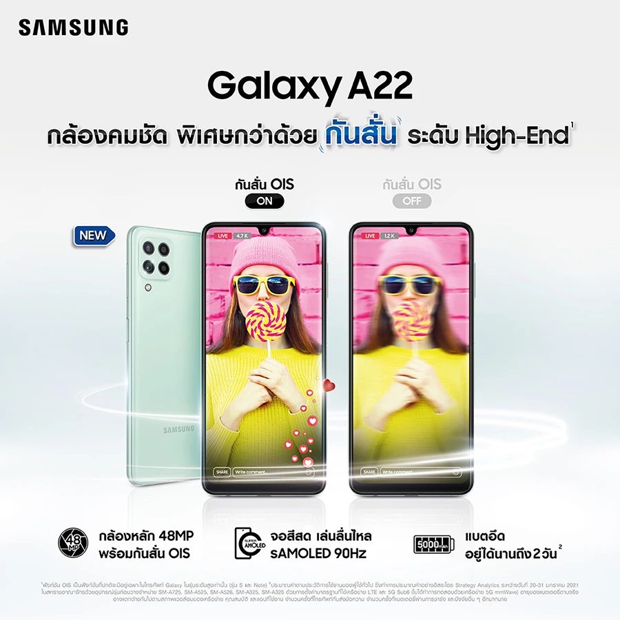 ดังนั้น เขาจึงต้องการตัวช่วยอย่างกล้องสมาร์ทโฟนคุณภาพสูง ซึ่ง Galaxy A22 นั้นได้ถูกออกแบบมาเพื่อตอบอินไซต์ข้อนี้โดยเฉพาะด้วยกล้องหลังระดับโปรถึง 4 ตัว โดยจุดเด่นอยู่ที่กล้องหลักความละเอียดสูง 48 ล้านพิกเซล ที่มาพร้อมนวัตกรรม OIS กันสั่นระดับ High-End ซึ่ง ณ ขณะนี้ ซัมซุงเป็นเพียงแบรนด์เดียวในตลาดที่มอบฟีเจอร์ดังกล่าวในสมาร์ทโฟนระดับราคาเดียวกัน สามารถบันทึกภาพถ่ายและวิดีโอได้คมชัดทุกสถานการณ์แม้ในที่แสงน้อย รวมถึงกล้อง Ultra-Wide 8 ล้านพิกเซล ที่ช่วยเก็บภาพในมุมมองที่กว้างเสมือนตาเห็นถึง 123 องศา และยังมีกล้อง Macro 2 ล้านพิกเซล สำหรับถ่ายภาพระยะใกล้ได้อย่างชัดเจนทุกรายละเอียด รวมถึงกล้อง Depth 2 ล้านพิกเซล ช่วยเพิ่มโฟกัสให้กับคอนเทนต์หน้าชัดหลังละลายได้ดียิ่งขึ้น นอกจากนี้ Galaxy A22 ยังมาพร้อมกล้องหน้าคมชัด 13 ล้านพิกเซล ให้เซลฟี่สวย โดดเด่นไม่เหมือนใคร