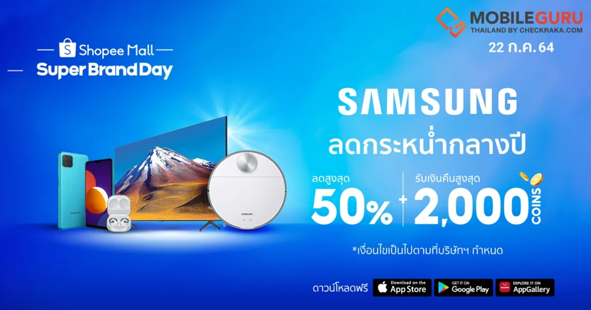 พบกับสิทธิพิเศษมากมายในแคมเปญ "Samsung Super Brand Day" ทางช้อปปี้ได้ในวันที่ 22 กรกฎาคม 2564 ติดตามรายละเอียดเพิ่มเติมได้ที่ https://shopee.co.th/sbd-samsung-22jul