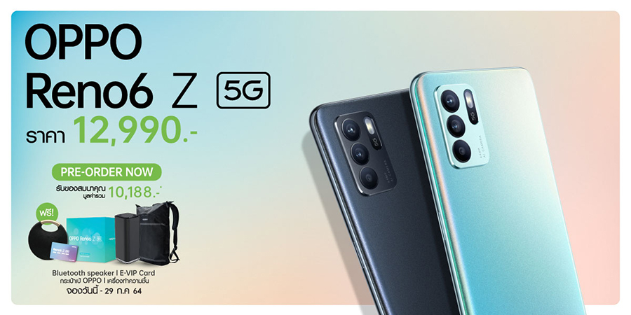 พิเศษ! เมื่อจอง OPPO Reno6 Z 5G สมาร์ทโฟนรุ่นใหม่ล่าสุด ให้คุณบันทึกทุกอารมณ์และความรู้สึกได้ด้วยพอร์ตเทรต มาพร้อมกล้องหลัง 3 ตัวความละเอียดสูงสุด 64MP, Bokeh Flare Portrait โหมดเบลอแสงพื้นหลังให้กลายเป็นดวงไฟโบเก้สวยงามได้ทั้งกลางวันและกลางคืน พร้อมใช้งานได้ทั้งกล้องหน้าและกล้องหลัง และ Portrait Beautification Video โหมดถ่ายวิดีโอพอร์ตเทรตที่ช่วยให้คุณสวยเป๊ะในทุกช็อต พร้อมเร็วแรงด้วย RAM 8GB, ROM 128GB และ 30W VOOC Flash Charge 4.0 ชาร์จแบตเตอรี่ 100% ได้ในเวลาเพียง 49 นาที โดยเปิดจองในราคาเพียง 12,990 บาท พิเศษรับเลย! OPPO E-VIP CARD ประกันหน้าจอแตกนาน 1 ปี, Bluetooth Speaker, กระเป๋าเป้ OPPO, หมอนผ้าห่ม และเครื่องทำความชื้น มูลค่ารวมถึง 10,188 บาท ตั้งแต่วันนี้ - 29 กรกฎาคมนี้ เท่านั้น