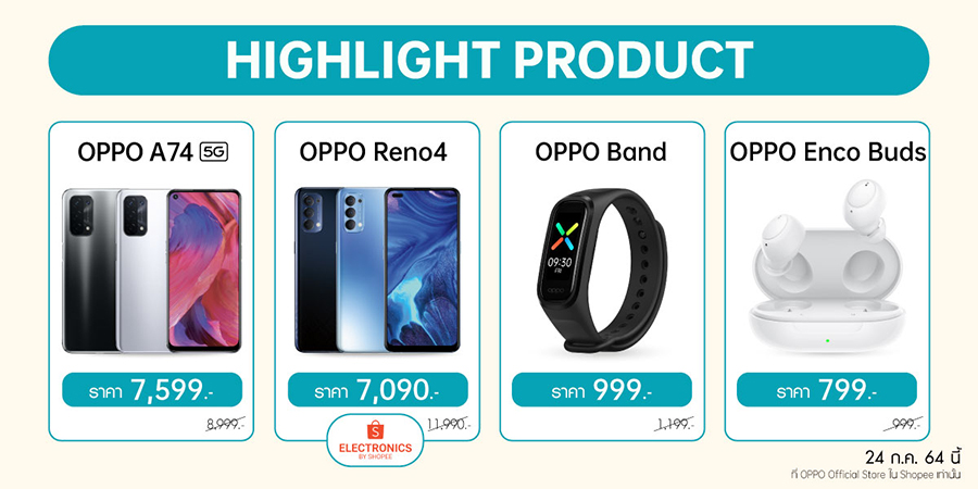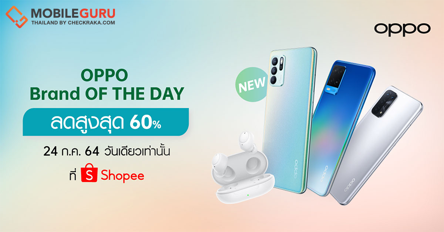 OPPO แบรนด์สมาร์ทโฟนชั้นนำในไทย จัดโปรโมชั่นสุดคุ้มเอาใจขาช้อป ด้วยแคมเปญ OPPO Brand OF THE DAY กับสินค้าหลากหลายรายการทั้งสมาร์ทโฟนและอุปกรณ์เสริมลดสูงสุด 60% พร้อมคูปองส่วนลดสูงสุด 1,100 บาท และของรางวัลสุดเซอร์ไพรส์มากมายรวมมูลค่าถึง 208,056 บาท! เฉพาะวันที่ 24 กรกฎาคม 2564 ที่ OPPO Official Store บน Shopee เท่านั้น