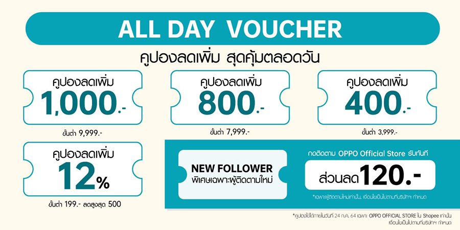 - Follow us! Voucher คูปองพิเศษเมื่อติดตาม OPPO Official Store ตั้งแต่วันที่ 23 กรกฎาคม 2564 รับฟรี! คูปองส่วนลด 120 บาท เมื่อซื้อขั้นต่ำ 799 บาท โดยสามารถใช้คูปองได้ในวันที่ 23-25 กรกฎาคม 2564 เท่านั้น
