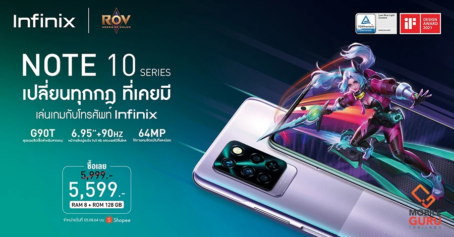 Infinix NOTE 10 Pro ชูจุดขายเอาใจสายเกมเมอร์ด้วยชิปเซ็ต MediaTek Helio G90T ที่ให้แรมมาถึง 8GB ผสานกับหน้าจอขนาดใหญ่ 6.95 นิ้ว แบบ FHD+ และอัตรารีเฟรชเรท 90Hz เพื่อตอบโจทย์การเล่นเกมที่ลื่นไหลสำหรับนักเล่นเกมมือถือตัวยง และยังเพลิดเพลินไปกับความบันเทิงได้อย่างเหนือระดับ ในราคาสุดคุ้ม 5,999 บาท กำหนดวางจำหน่ายแบบเอ็กซ์คลูซีฟบน Shopee เริ่มตั้งแต่วันที่ 5 สิงหาคมนี้ เป็นต้นไป และอีกรุ่นสำหรับ Infinix NOTE 10 มาในชิปเซ็ต MediaTek Helio G85 พร้อมกล้อง 48 ล้านพิกเซล ในขนาดหน้าจอที่เท่ากัน สามารถหาซื้อได้ที่ตัวแทนจำหน่ายทั่วประเทศ