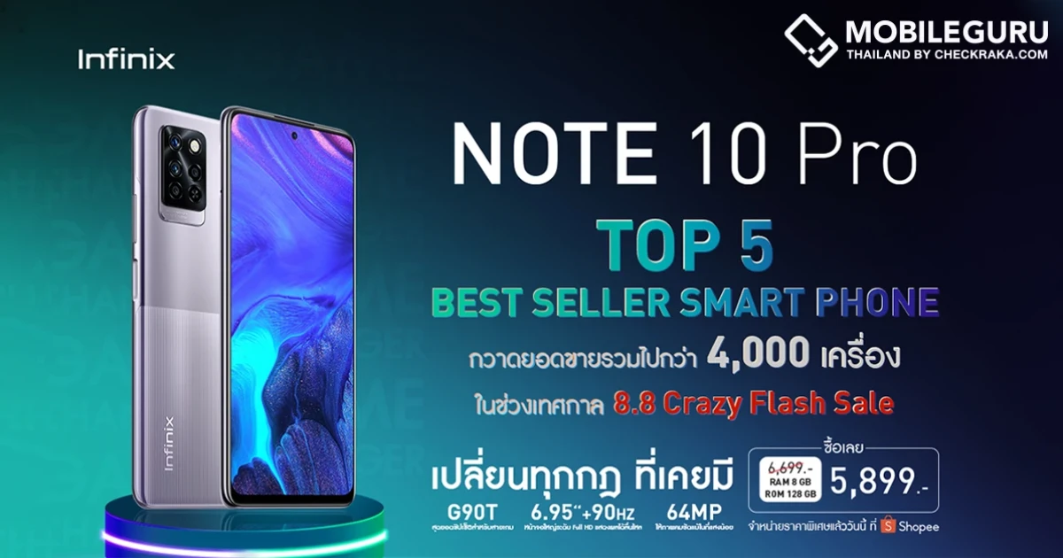 Infinix NOTE 10 Pro ติด TOP 5 Best Seller Smartphone บน Shopee ในช่วงเทศกาล 8.8 Crazy Flash Sale