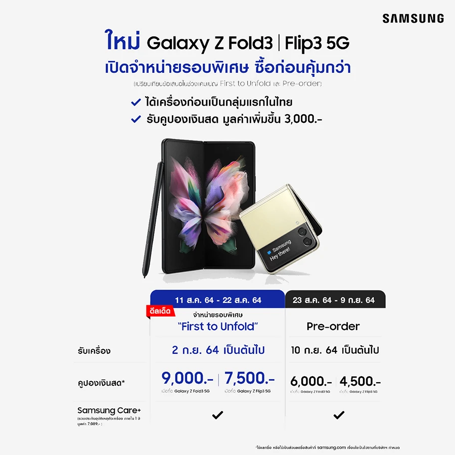 ทั้งนี้ ซัมซุงได้เปิดจำหน่ายรอบพิเศษ ที่ซื้อก่อนคุ้มกว่า กับ 'First to Unfold' ตั้งแต่วันนี้ – 22 ส.ค. 64 นอกจากที่จะได้เครื่องก่อนเป็นกลุ่มแรกในไทย ในวันที่ 2 ก.ย. 64 เป็นต้นไปแล้ว ยังจะได้รับคูปองเงินสดเพิ่มขึ้นอีก 3,000 บาท รวมเป็นมูลค่า 9,000 บาท เมื่อซื้อ Galaxy Z Fold3 5G หรือมูลค่า 7,500 บาท เมื่อซื้อ Galaxy Z Flip3 5G เมื่อเทียบกับช่วงพรีออเดอร์ (23 ส.ค. - 9 ก.ย.) ที่จะได้เพียง 6,000 และ 4,500 บาทตามลำดับเท่านั้น ไม่รวมถึงการรับฟรีบริการ Samsung Care+ 1 ปี มูลค่า 7,089 บาทอีกด้วย คลิกเข้าไปดูรายละเอียดได้แล้ววันนี้ที่ www.samsung.com/th/zfold3/buy